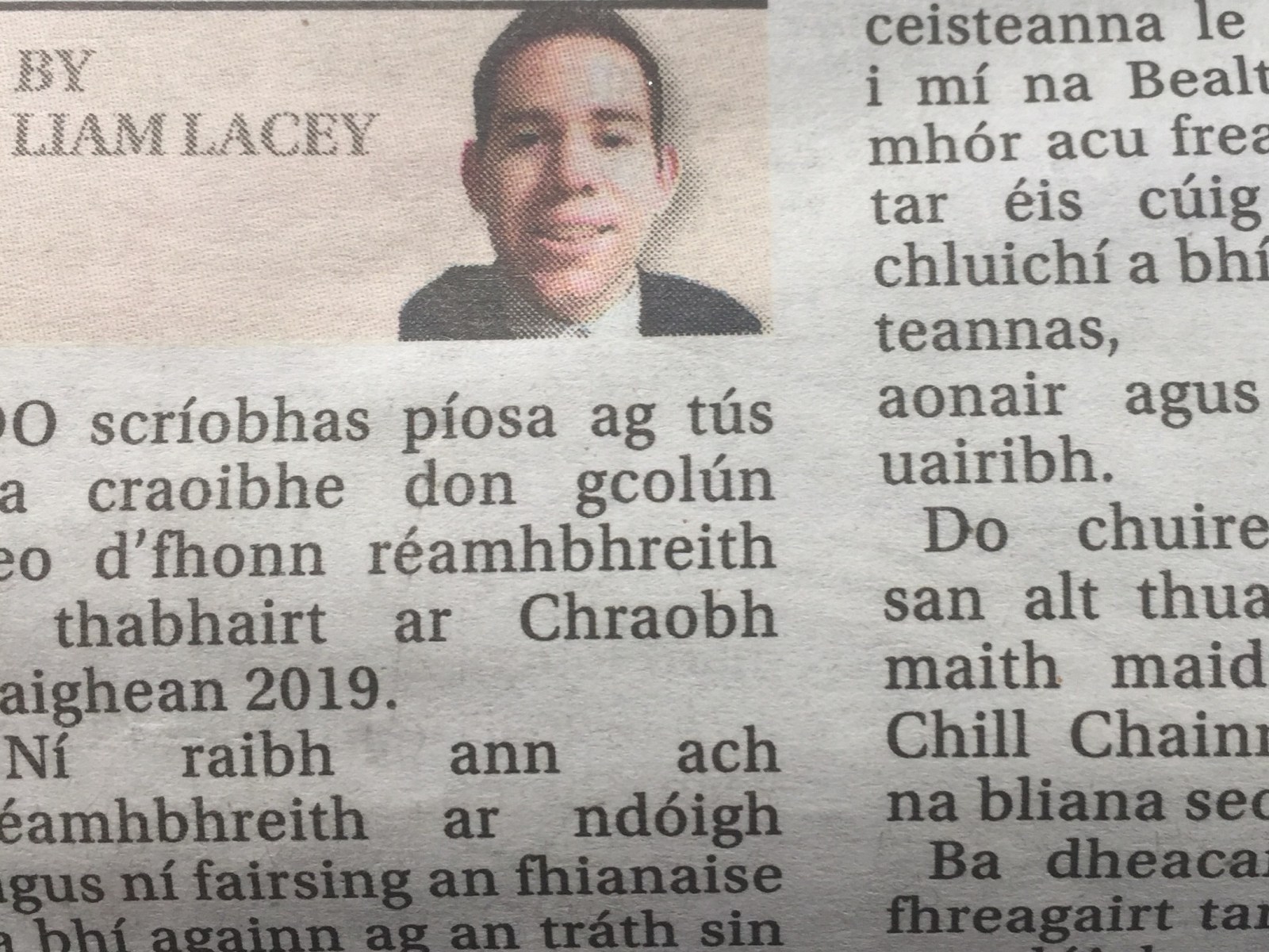 Tá colún nua seachtainiúil ag Liam de Lása leis an bpáipéar áitiúil Kilkenny Observer gach aon Aoine. Bíonn na cluichí CLG á phlé aige sa cholún seo agus cuirtear aistriúchán ar fáil leis chomh maith. Is deis iontach é sin do Ghaeilgeoirí an chontae agus d’fhoghlaimeoirí chun an teanga a fheiscint go háitiúil. B’fhiú go mór tacaíocht a thabhairt do Liam sa bhfiontar nua seo. Tá an nuachtán seo ar fáil SAOR IN AISCE chomh maith.
